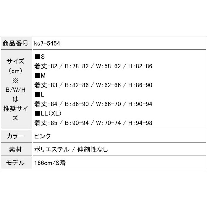 商品番号 ks7-5454 / ks2-3740 サイズ(cm)※B/W/Hは推奨サイズ ■S着丈:82 / B:78-82 / W:58-62 / H:82-86 ■M着丈:83 / B:82-86 / W:62-66 / H:86-90 ■L着丈:84 / B:86-90 / W:66-70 / H:90-94 ■LL(XL)着丈:85 / B:90-94 / W:70-74 / H:94-98 カラー ピンク 素材 ポリエステル / 伸縮性なし モデル 166cm/S着 詳細 キャミソールタイプの肩出しとタイト気味の細見えのボディラインに大人のセクシーな色気を感じさせる、ショート丈ノースリーブワンピースです。