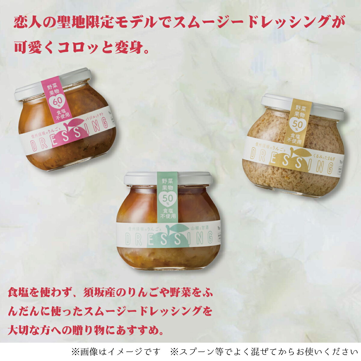 【ふるさと納税】信州須坂スムージードレッシング3本セット【恋人の聖地限定モデル】《株式会社 信州オーガニックフーズ》【果物・野菜・ドレッシング・調味料・りんご・くるみ・ごま】 【食塩不使用!野菜を野菜と果物で食べるドレッシング】に限定モデルが登場! ○恋人の聖地限定モデルでスムージードレッシングが可愛くコロッと変身。