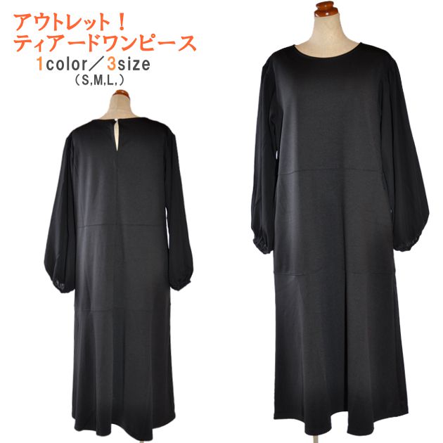 ティアード ワンピース アウトレット バルーンスリーブ 袖切替え 異素材 ストレッチ 袖口ゴム ゆったり ポケット付 おしゃれ カジュアル 大人 可愛い 秋 冬 春 秋服 冬服 春服 小さいサイズ ロング丈 S M L 黒 ブラック 677730
