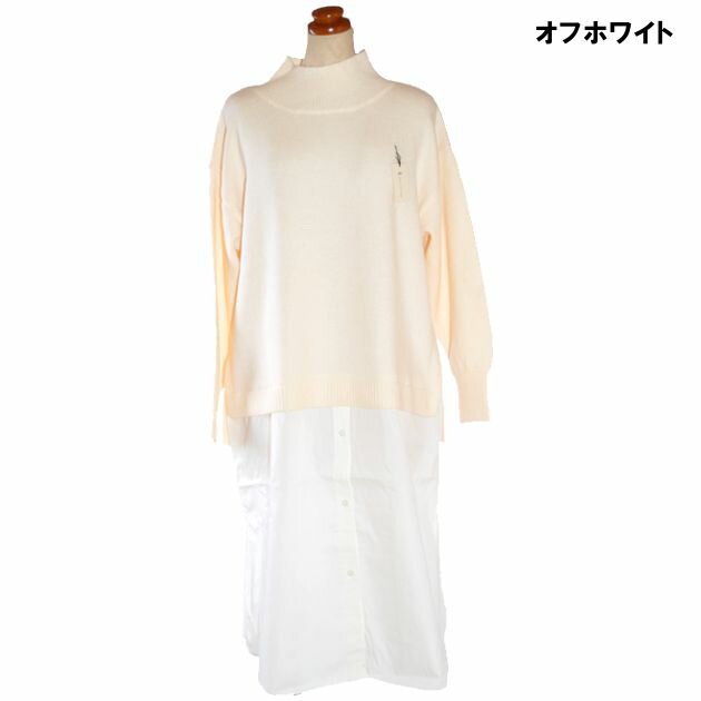 アウトレット!ニット+シャツ・ドッキングワンピース トップ部分はモックネックセーター、ボトムい部分はシャツのドッキングデザインのワンピース♪