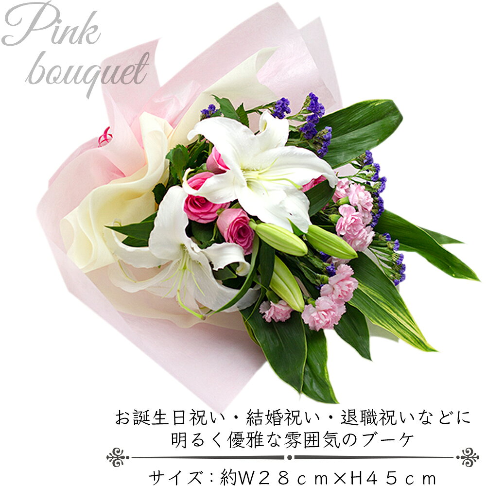 ●花束サイズ:[長さ]約45cm [幅]約25cm ●生花内容:ユリ・バラを中心に季節のお花でお作りいたします。