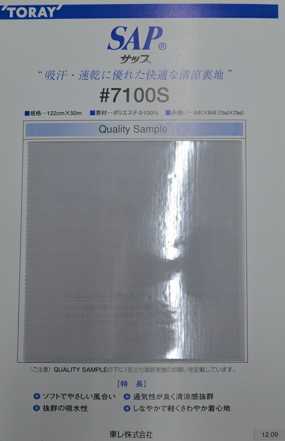 **東レ サップ#7100S 裏地122cm×1m色見本1 夏用 薄い 生地 ソフト 吸水 軽い 通気性 ポリエステル100% 吸汗 速乾 ポリエステル100%の清涼感のある薄手のしっとりした裏地です。 ポリエステル100%の清涼感のある薄手のしっとりした裏地です。 商品価格:770円 レビュー件数:1件 レビュー平均:5(5点満点) 楽天で購入 トップページへ