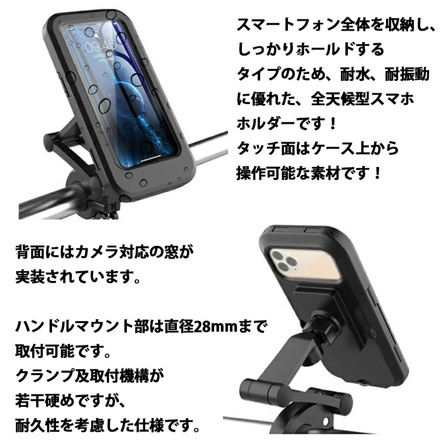 ITEM IMAGES ・雨の日でも安心!全天候型スマホホルダー ・スマートフォンをそっくり収納して耐水性もバツグン! カメラもご利用いただけます! ・充電ケーブルもご利用いただけます! ・アームのレイアウトや回転するジョイントで自由な位置で使えて便利! 商品の特徴 ケースは若干大きめなフリーサイズです