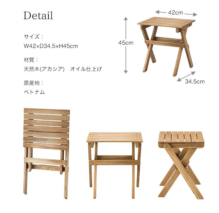 商品説明サイズ 幅 42cm 奥行 34.5cm 高さ 45cm 材質天然木(アカシア)オイル仕上げ色 商品説明 コンパクトな折りたたみ式木製チェアです。