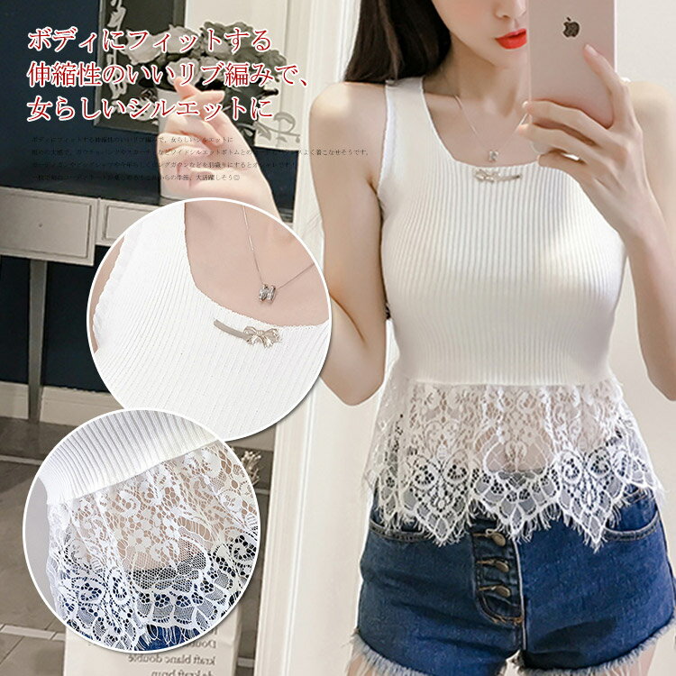 裾レース切り替えトップス ショート丈ニットトップス ニットタンクトップ ニットキャミソール ニット キャミソール ショート丈 サマー セクシー レース レディース 春 夏 可愛い送料無料