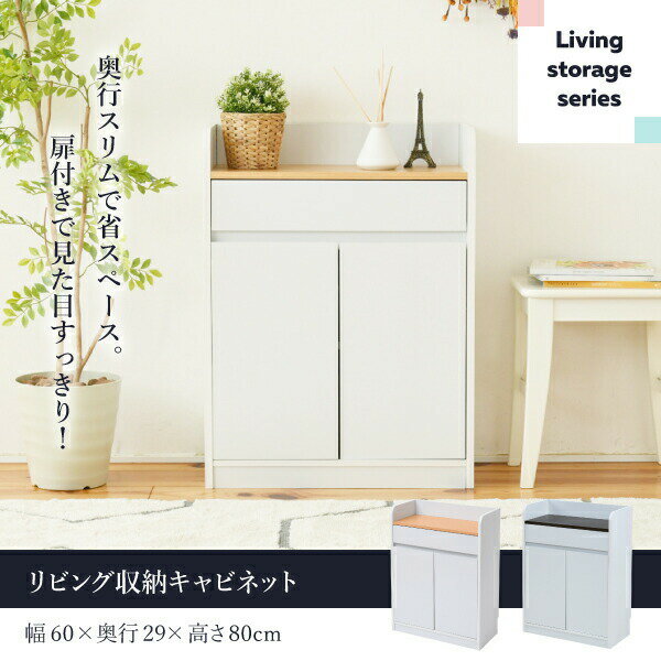 商品説明(spec等)サイズ[外寸]幅60×奥行29×高さ80cm[内寸](上オープン部)幅56×奥行27×高さ9.5cm(扉内)幅49×奥行18.5×高さ47cm(引き出し)幅53×奥行22×高さ6.5(有効:8)cm(可動棚)幅56×奥行23×厚み1.8cm(3.2cmピッチ9穴)収納量・耐荷重[天板]約10kg以下[引き出し]約5kg以下[可動棚]約7kg以下梱包サイズ(cm)幅(横)×奥行(縦)×高さ:64.5×33×16.5梱包重量(?) :15.8素材[本体]プリント紙化粧合板[天板]合成樹脂化粧合板(PVC)カラーホワイトナチュラル・ホワイトダークブラウン(WHNA・WHDB)生産国中国商品説明スタイリッシュなデザインと扉付きの収納庫で「隠す収納」にぴったりなキャビネット。