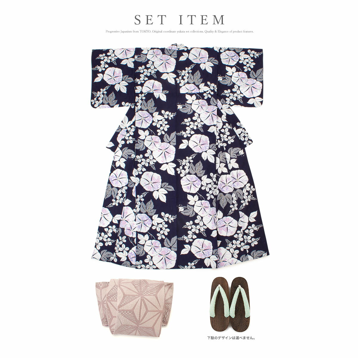 【8/18~21★クーポンで10%OFF】浴衣 セット レディース レトロ 浴衣セット 3点セット 紺 ネイビー 白 撫子 なでしこ 朝顔 萩 花 ラメ 手捺染 綿麻 兵児帯 女性 ボヌールセゾン マクレ 30代 40代 ママ 大人浴衣 フリー 【送料無料】【あす楽対応】
