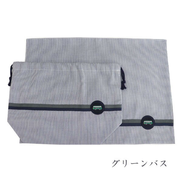 手洗いカラーレースリボン:紺ステッチリボン・グリーンバス:ネイビーコードレーン(細かいストライプ地)お受験 お弁当考査 ランチセット2点 紺 ネイビー 日本製 お弁当 巾着 給食 ランチ 入園 入学 幼稚園 小学校 通学 子供 キッズ 刺繍 バス ステッチ リボン のりもの 男の子 女の子 おしゃれ かわいい ランチョンマット 給食袋 お弁当巾着 ランチクロス ジョリコムアンクール きちんと感漂うランチセット。