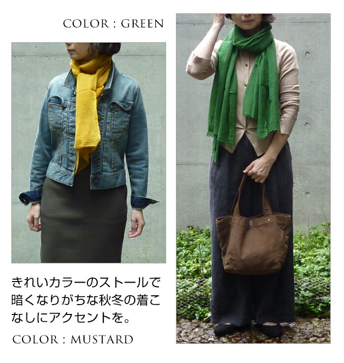 カラー ブルー《BLUE》・グリーン《GREEN》・マスタード《MUSTARD》・カシス《CASSIS》・ライトグレー《LIGHT GRAY》 全5カラー 素 材 100%ウール 実寸サイズ 長さ:180cm×幅:67cm 重 量 95g 生産地 インド製